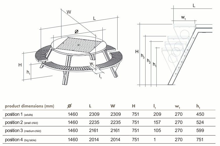 Gargantua est une grande table ronde d’extérieur qui offre une fonctionnalité supérieure. Ses bancs réglables en hauteur peuvent être changés en fonction des circonstances sociales ou familiales. Elle dispose de niveaux pour les adultes et les enfants, petits et grands. Le banc rond de pique-nique peut également être utilisé comme une extension du plateau de la table. Cette table d’extérieur peut accueillir de 8 à 12 personnes. Les personnes en fauteuil roulant peuvent également rejoindre facilement la table si l’une des banquettes est enlevée. Gargantua est également idéal comme mobilier d’extérieur pour les espaces urbains et les environnements de projet.