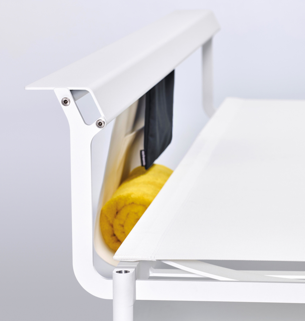 Le Sol + Luna est disponible en deux versions : Australis (l. 210 x p. 77 x h. 60,5 / 35) et Borealis (l. 200 x p. 86 x h. 62 / 35). L’Australis est austère et architectural, tandis que le Borealis a une conception plus organique. Les deux variantes ont un cadre en acier peint par poudrage et un siège en maille de haute qualité qui draine l’eau et sèche rapidement. Le mobilier est disponible en blanc et en noir et peut être équipé des mêmes fonctionnalités.
