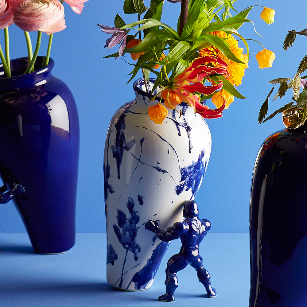 Le vase My Superhero attire vraiment l’attention. Le vase coudé est soutenu par votre propre super-héros. Entièrement fait à la main en céramique. Le vase est disponible dans différents traitements spéciaux de couleur. Jasmin Djerzic a conçu son propre bleu de Delft pour un ajout contemporain à votre intérieur. Le vase est disponible en blanc/doré, bleu/doré et jaune/doré. L’or est fini avec des gouttes d’or de 24 carats. Tout le monde veut un super-héros dans la maison !