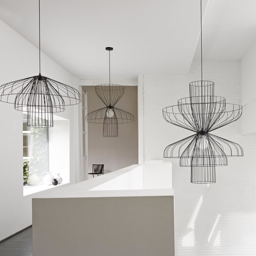 Abat-jour en fil d’acier laqué noir satiné (Ø 3 mm) ou en fil d’acier cuivré vernis transparent (Ø 3 mm). Il est possible de monter 1, 2, 3, 4, 5 ou 6 abat-jour à l’endroit ou à l’envers pour composer une multitude de suspensionsdifférentes. Toutefois, toutes les compositions ne sont pas possible. en effet, il faut toujours être au minimum symétrique pour avoir plus d’abat-jour orientés vers le bas que d’abat-jour orientés vers le haut.