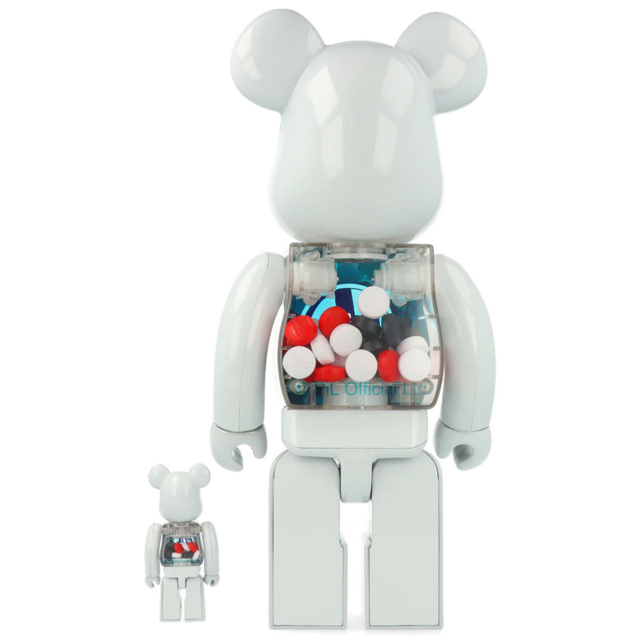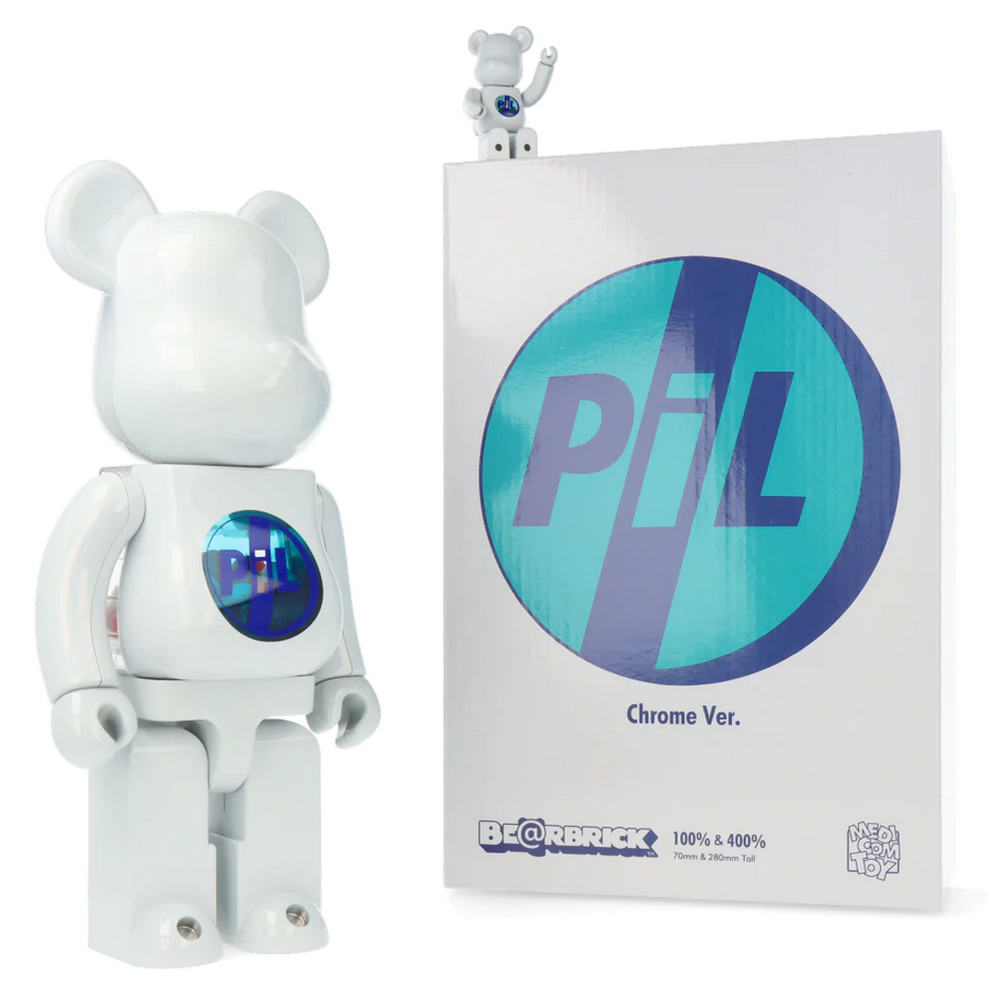 Souvent appelé PiL, ce célèbre groupe s’offre une nouvelle version pour leur Bearbrick dans une version chrome des plus classieuses. Cette fois-ci il s’agit du set 400% + 100% Bearbrick PiL toujours avec ce ventre transparent qui laisse apparaître des petits cachets bleus qui en font un Bearbrick surprenant et unique.