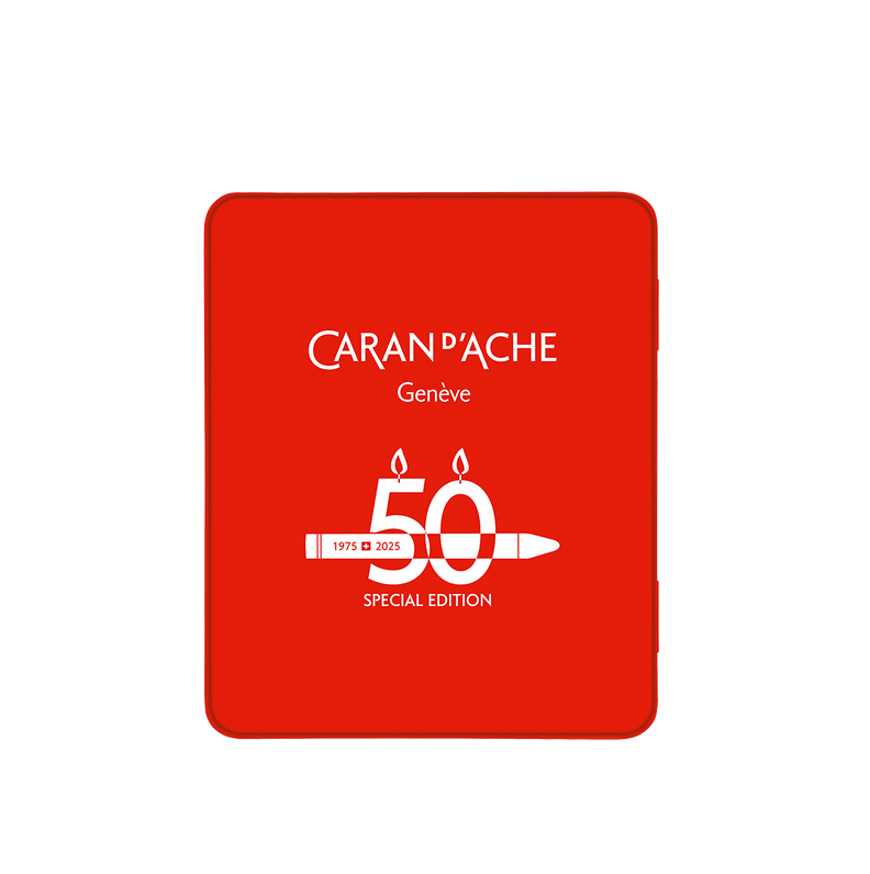 Boîte rouge en métal iconique revêtue du logo anniversaire 50 ans