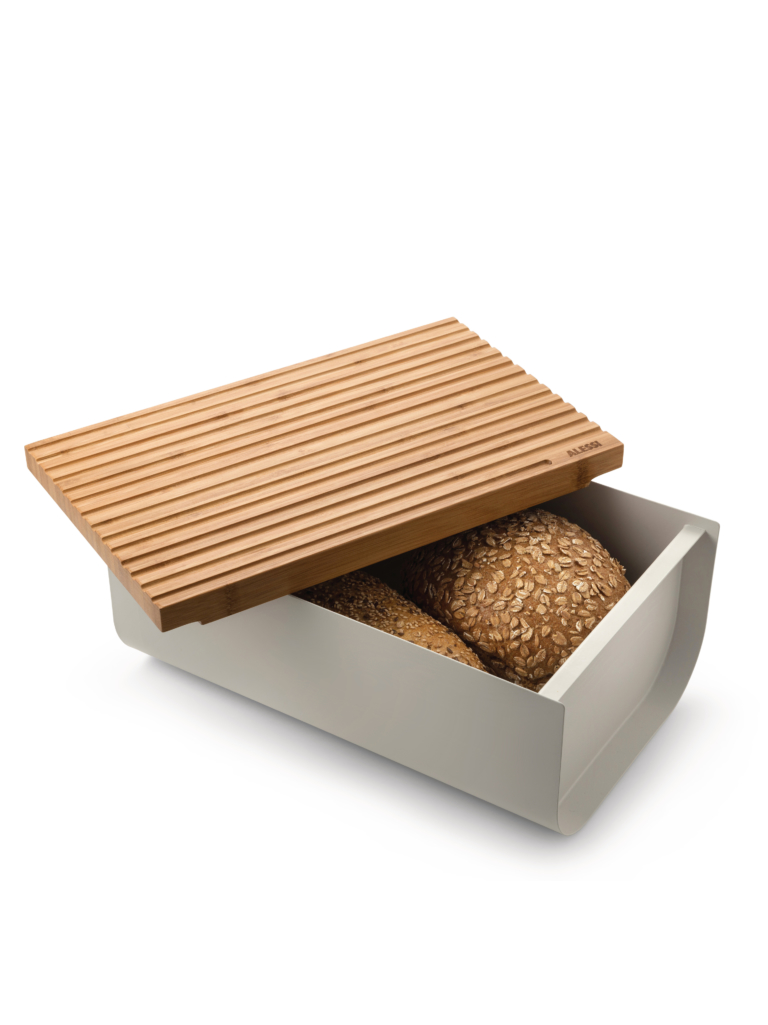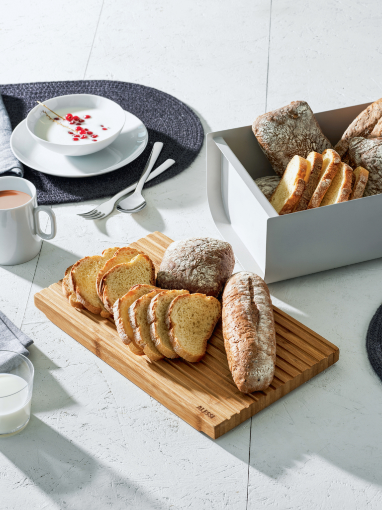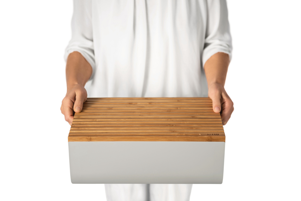 Le cabinet de design Big-Game propose un objet multifonction conçu pour accompagner un geste quotidien, la consommation du pain, en mettant en valeur sa nature rituelle et conviviale. Mattina ne sert pas uniquement à poser le pain : c’est un contenant ayant pour couvercle une planche à pain conçue pour couper des tranches au mieux, sans que les miettes ne tombent sur le plan de travail. Un objet polyvalent qui peut être utilisé également pour apporter le petit déjeuner sur la table.