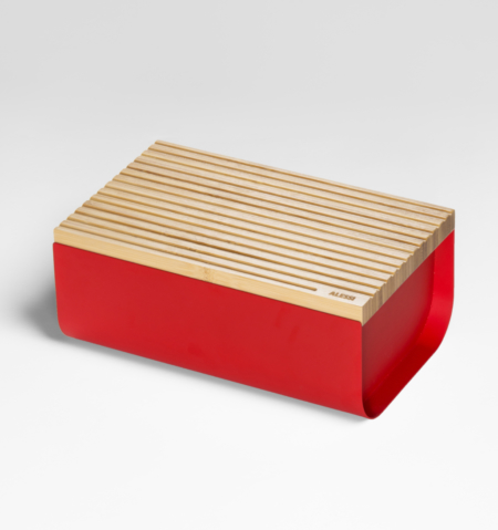 Boite à pain en acier coloré à la résine au époxyde avec planche à découper en bois de bambou.
