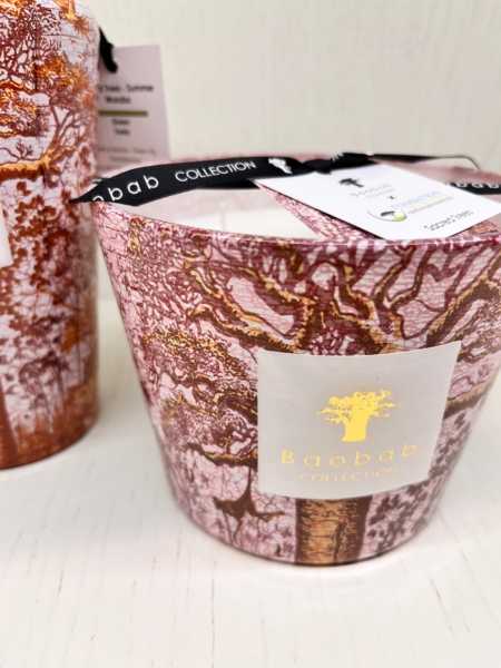 Sur le verre de la bougie parfumée Woroba, un grand baobab brun sur fond rose s’élève au milieu d’une savane rappelant la délicatesse de tissus anciens. Le dessin sur le verre est réalisé en Italie grâce à l’expertise de la sublimation. À travers le décor, on peut voir la flamme et celui-ci s’anime comme une lampe donnant vie à la bougie.
