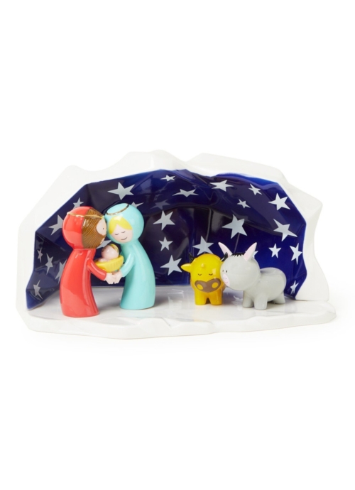 La crèche est en porcelaine peinte aux dimensions L 27 cm x P 14 cm x H 20 cm.