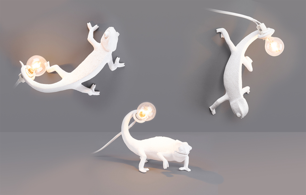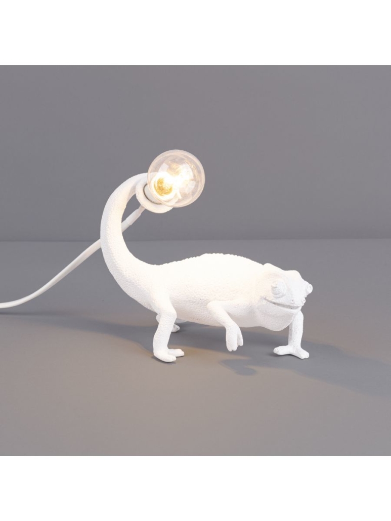 Lampe murale montante de la collection Chameleon éditée par Seletti composée d’une structure figurative en résine sculptée en forme de Caméléon tenant une douille équipée d’un long câble d’alimentation avec prise de secteur et interrupteur.
