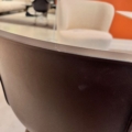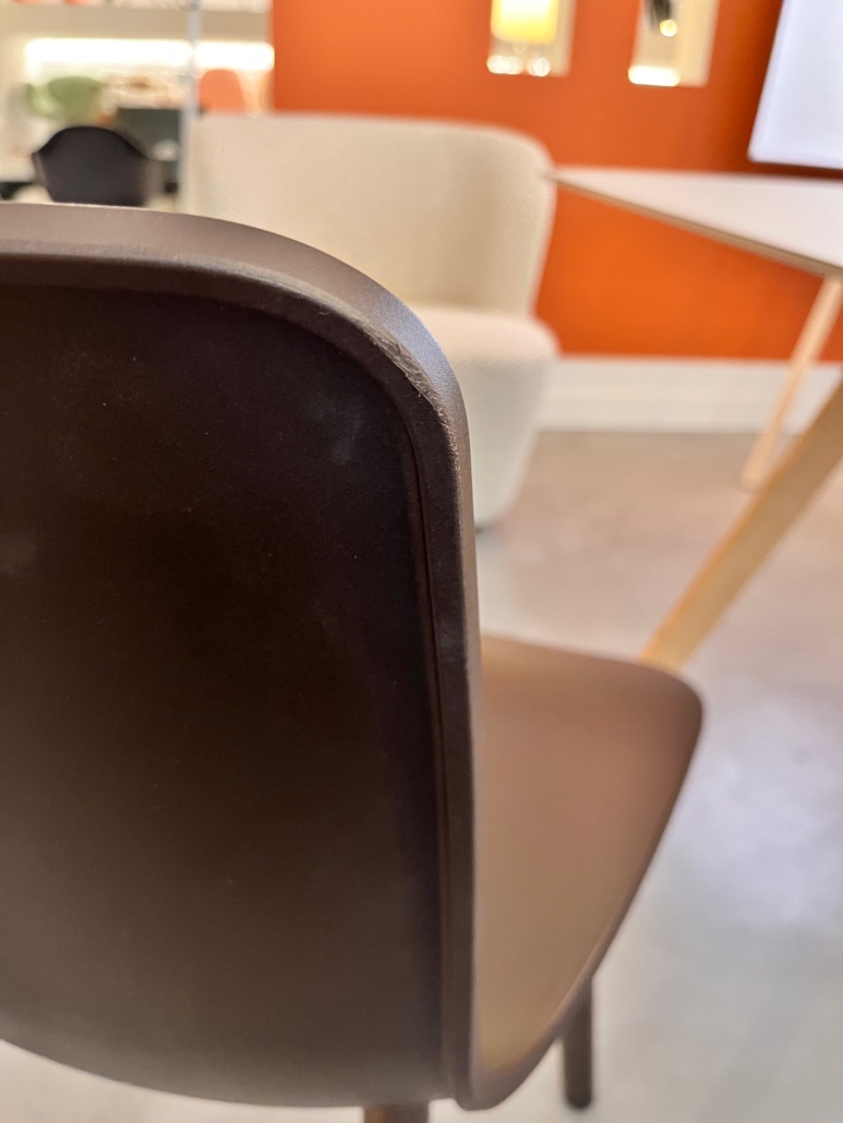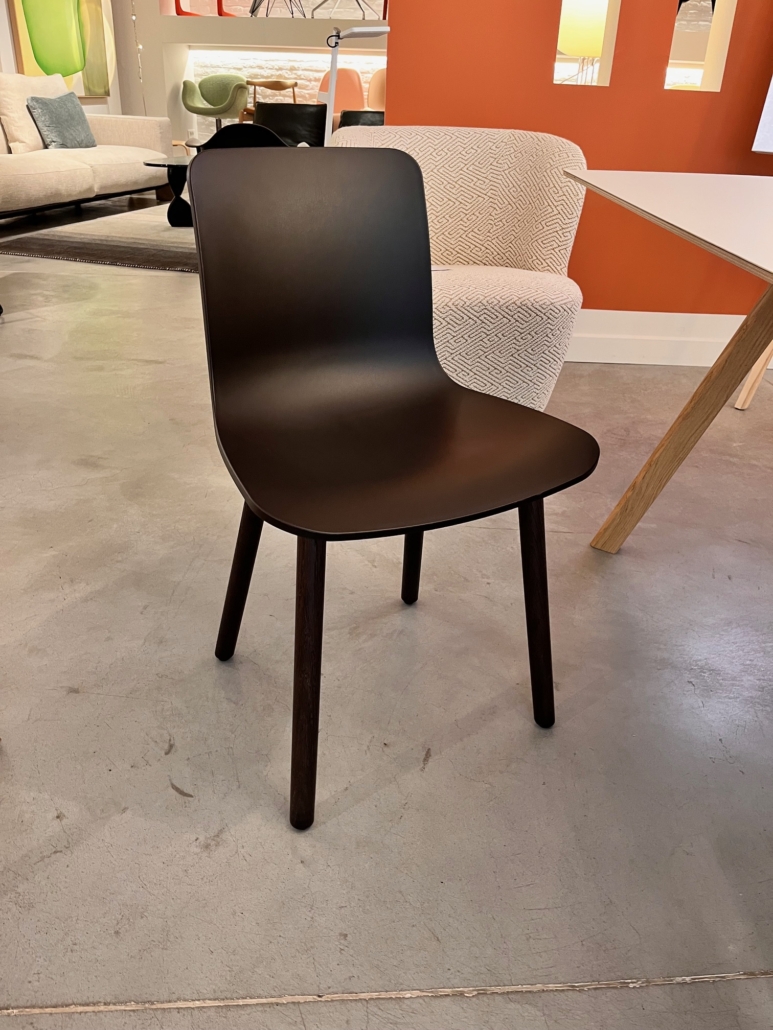 Finition : piétement chêne foncé, coque chocolat