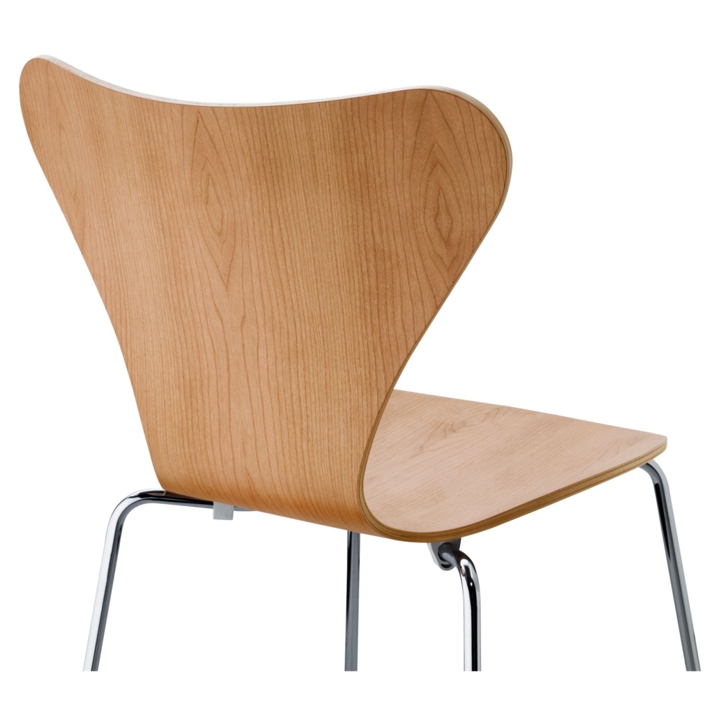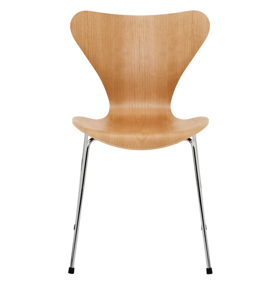 L’assise ergonomique en contreplaqué cintré à la vapeur de la chaise 3107 est composée de neuf couches de placage. Sa finition laquée met en valeur le grain naturel du bois de cerisier, conférant à chaque chaise un aspect unique. Des pieds en acier chromé complètent l’esthétique scandinave raffinée de la chaise Série 7 3107.