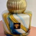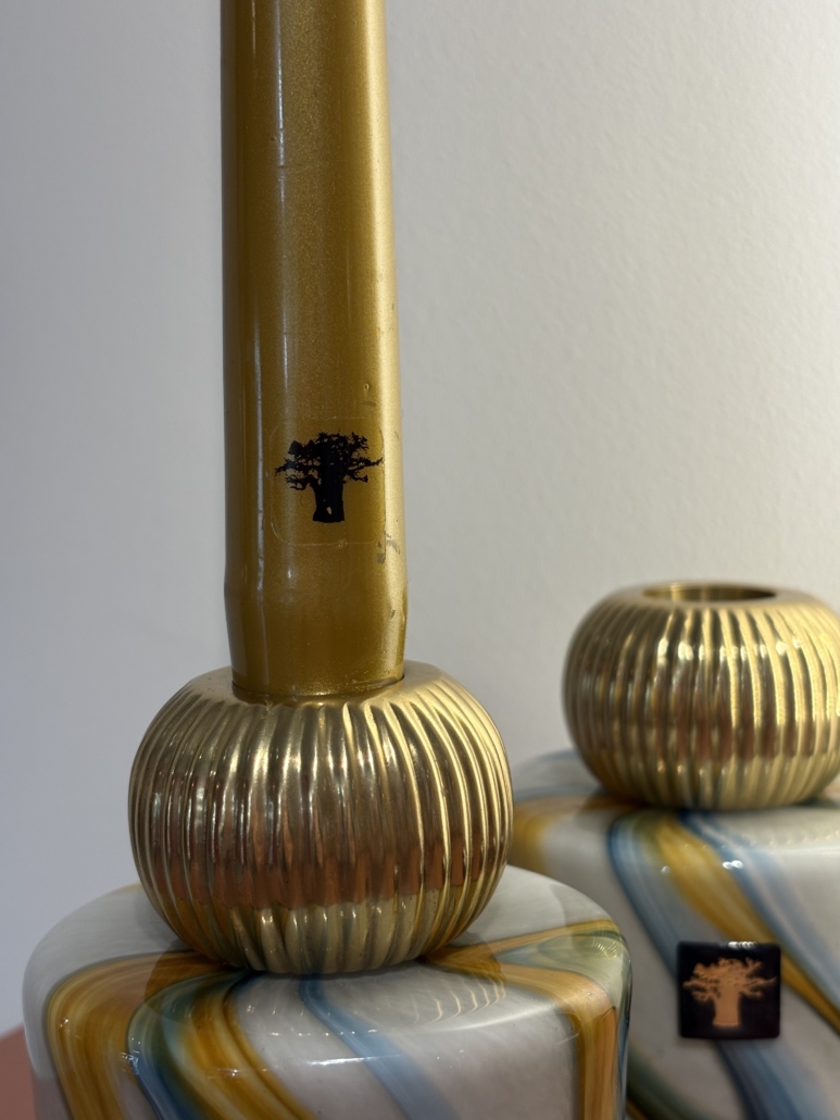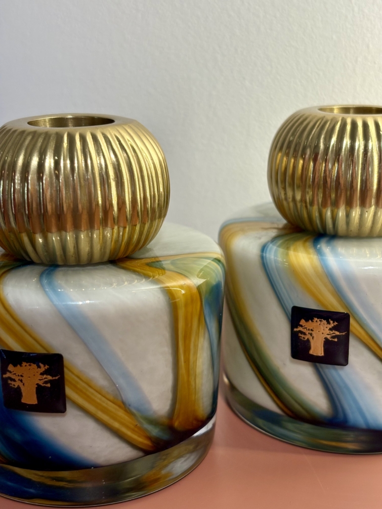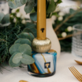 Les bougeoirs Twins Holy sont en verre soufflé bouche réalisés par nos artisans verriers. Le verre aux volutes bleues outremer et safrans est terminé d’une boule de métal godronnée or sur laquelle la chandelle se fixe.