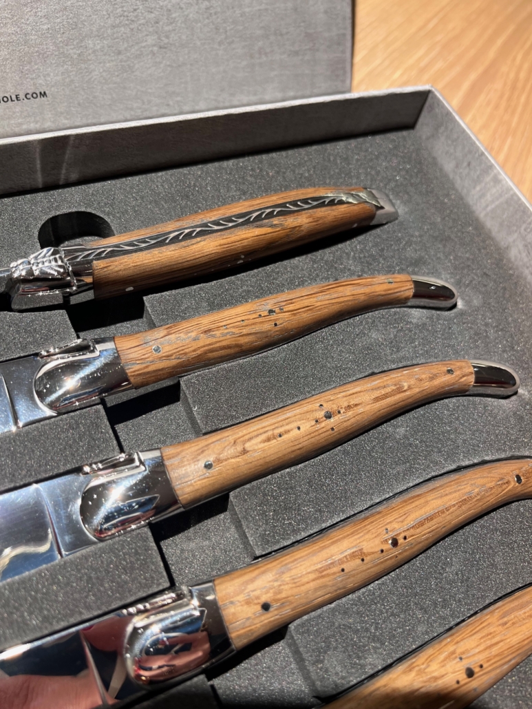 Ce coffret se compose de 6 couteaux de table haut de gamme avec le manche en bois, cœur de chêne subfossile, finition brillante.