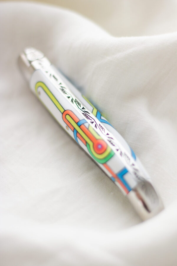 Ce couteau est issu d’une nouvelle technologie de sublimation qui consiste à venir imprimer des motifs sur un manche en acrylique blanc pour venir décorer et moderniser le couteau pliant de Forge de Laguiole. Sur ce modèle le Street Art vient contraster les traditionnelles courbes du couteau Laguiole.