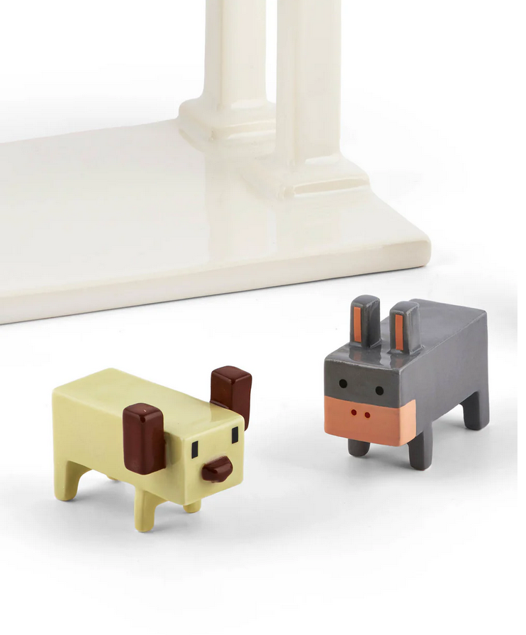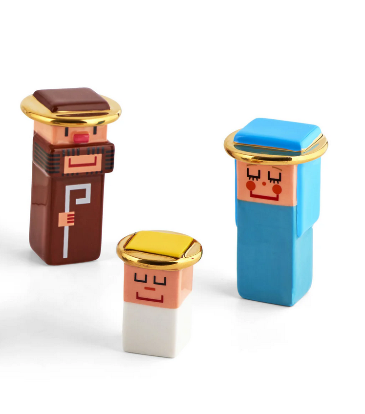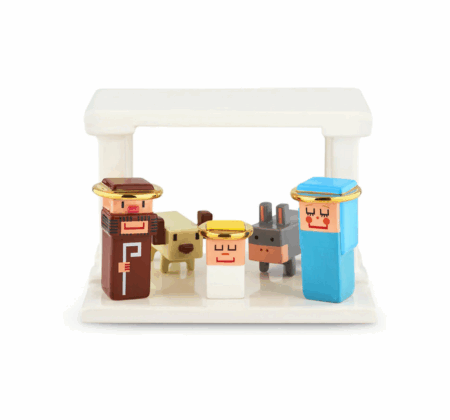 « Nous voulions faire une crèche du futur », ont déclaré Marcello Jori et Massimo Giacon en présentant Miracolo!, (Miracle!), où les figurines de la Nativité ont une forme carrée qui évoque l’esthétique des jeux vidéo. Les figurines géométriques s’insèrent dans une cabane tout aussi linéaire et créent ainsi une composition située entre tradition et avant-garde. Un objet au contenu artistique important, à mi-chemin entre l’industrie et l’artisanat, qui renferme toute l’émotion de l’œuvre de ses auteurs.
