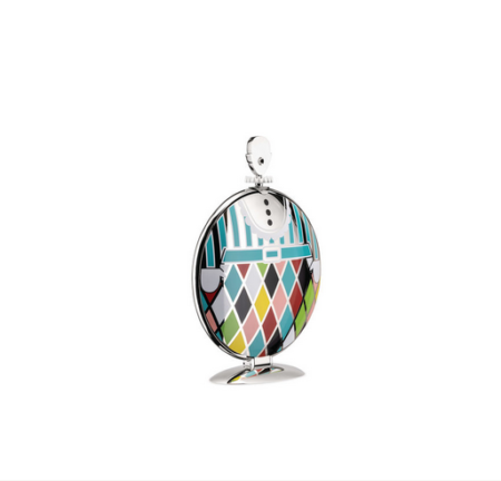 Fatman a été dessiné par Marcel Wanders qui a dirigé son attention sur la décoration de l’objet, en réalisant une sorte d’habit très coloré pour revêtir le Plateau à deux étages. Cet aspect rend l’objet polyvalent: fermé, c’est une sculpture de table ; ouvert, il devient un plateau à multiples étages pour servir à table. Dans ce sens ce n’est pas seulement un objet pliant, car quand on le ferme, il ne cesse pas simplement sa fonction de conteneur, mais il se transforme aussi en une statuette à admirer. La décoration colorée créée par Wanders, associée à la forme ronde, tend en effet à mettre l’accent sur la perception formelle de l’objet. Fatman, comme le dit son nom lui-même, présente les traits d’un homme au corps robuste, habillé comme un clown.