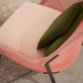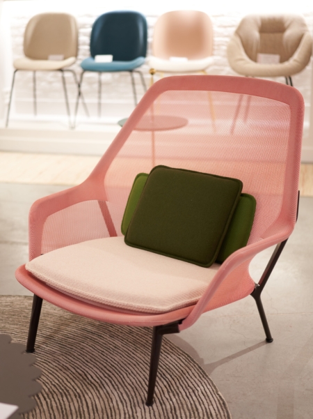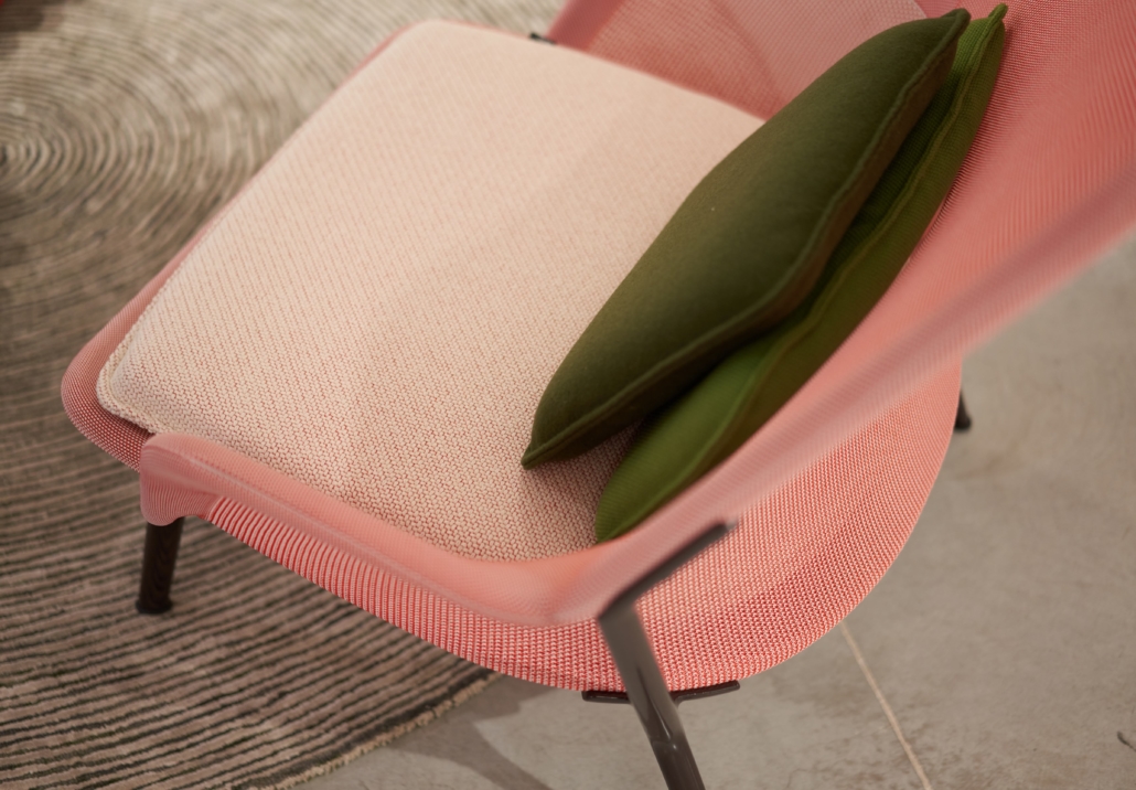 Pour leur large fauteuil, Ronan et Erwan Bouroullec utilisent un textile extrêmement résistant tricoté sur mesure, qui est enfilé comme un bas sur la structure du fauteuil et qui épouse parfaitement ses formes. Ce revêtement en jersey donne au Slow Chair un confort d’assise véritablement ergonomique, agréable et moelleux qui est augmenté par les minces coussins d’assise et de dossier.