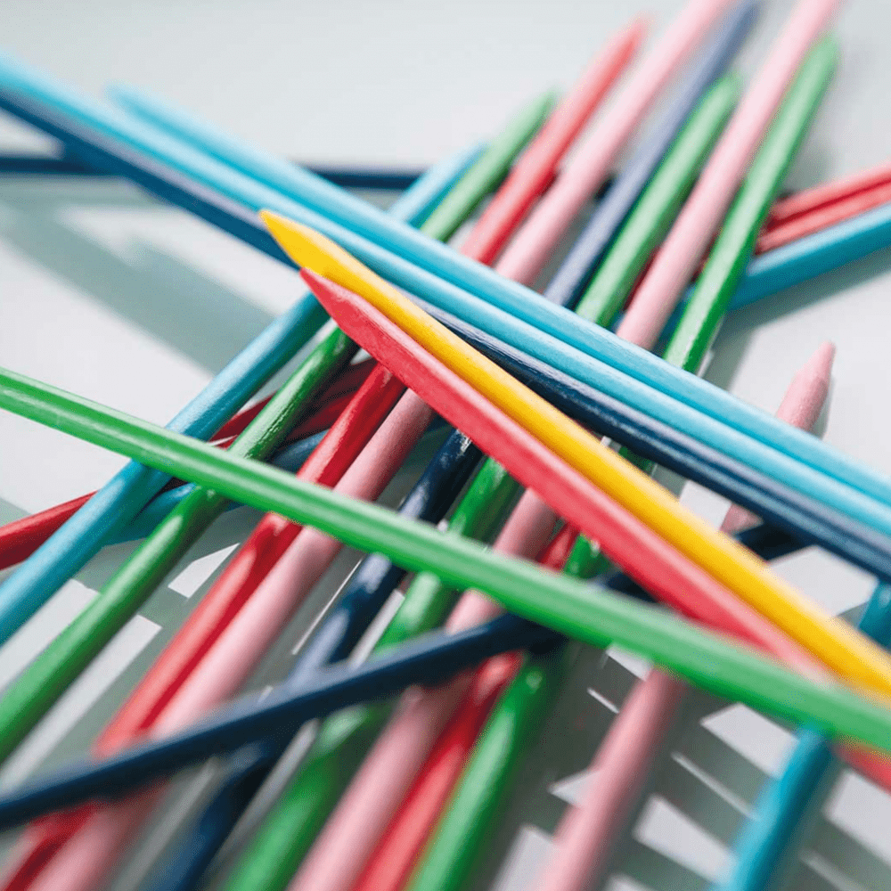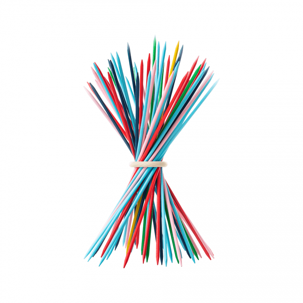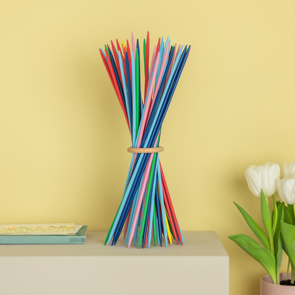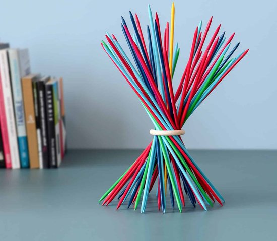 A partir de 6 ans, 1-8 joueurs, 50 bâtons en bois colorés en 6 couleurs différentes, anneau en bois