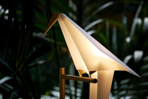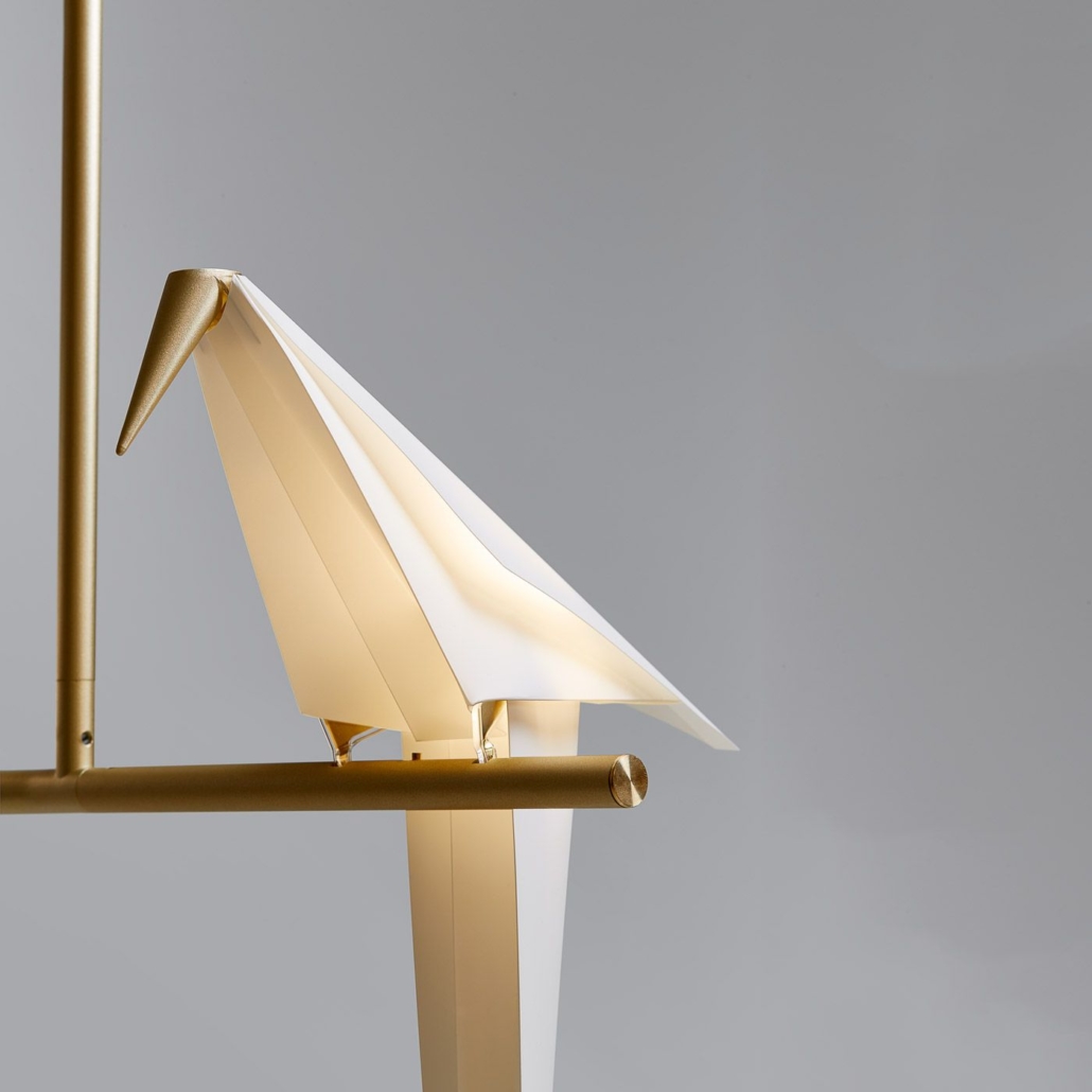Voyez cet oiseau en papier, gracieusement en équilibre sur son perchoir. Avec son bec doré et des traînées de métal précieux dans les plumes de sa queue. Sous les perchoirs, après la tombée de la lumière du jour, vous réalisez soudain que vous les avez regardés se balancer. Toute la journée. Au rythme de votre expiration, sous le charme de leurs lumières.