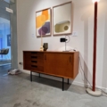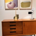 En 1953, les fondateurs de Meubles TV, éditeurs d’avant-garde, qui encouragent la conception et la production d’équipements en série, font appel à Pierre Guariche, qui leur dessine la série 140. Le buffet, appelé au catalogue 148, en sera le modèle emblématique. Composé d’une caisse en bois plaqué frêne teinté et d’un piètement en métal laqué noir, ce petit bahut est équipé d’une rangée de 4 tiroirs sur sa gauche et d’une seule porte coulissante sur sa droite. Le bahut comprend quatre tiroirs et une porte coulissante. La composition du bahut 148 est en MDF plaqué frêne teinté, les façades des tiroirs en frêne massif teinté. Les poignées ainsi que le piètement sont en métal laqué noir.