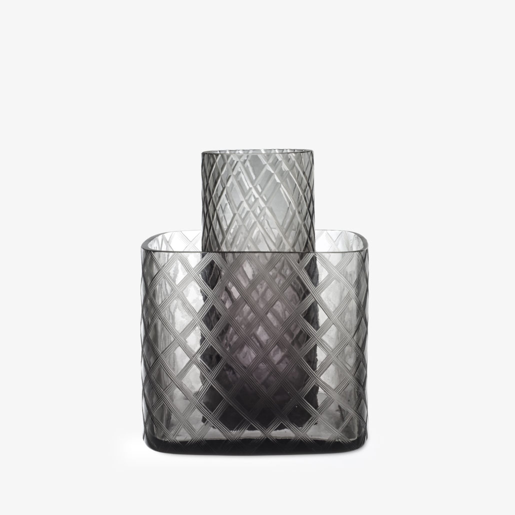 Vase composé de 2 pièces en verre gris teinté dans la masse, soufflé bouche avec motif de lignes gravées sur l’extérieur. Le vase cylindrique avec fond, est posé à l’intérieur du vase cubique. Vase cubique : 20,6 x 19,7 x 17 cm. Vase cylindrique : Ø 10 cm x H 24 cm.