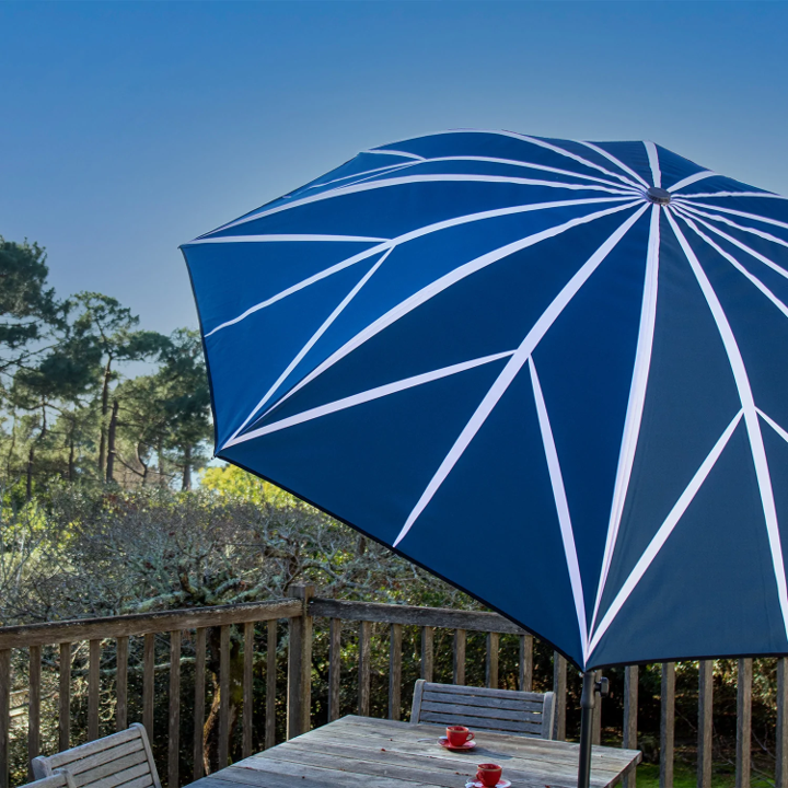 Modèle iconique de la marque, le Stella est un GRAND PARASOL BLEU élégant, discret mais résolument différent d’un simple modèle uni. PARASOL DE JARDIN HAUT DE GAMME au design sobre mais distinctif, il s’adapte bien à tous les extérieurs chic et intemporels.