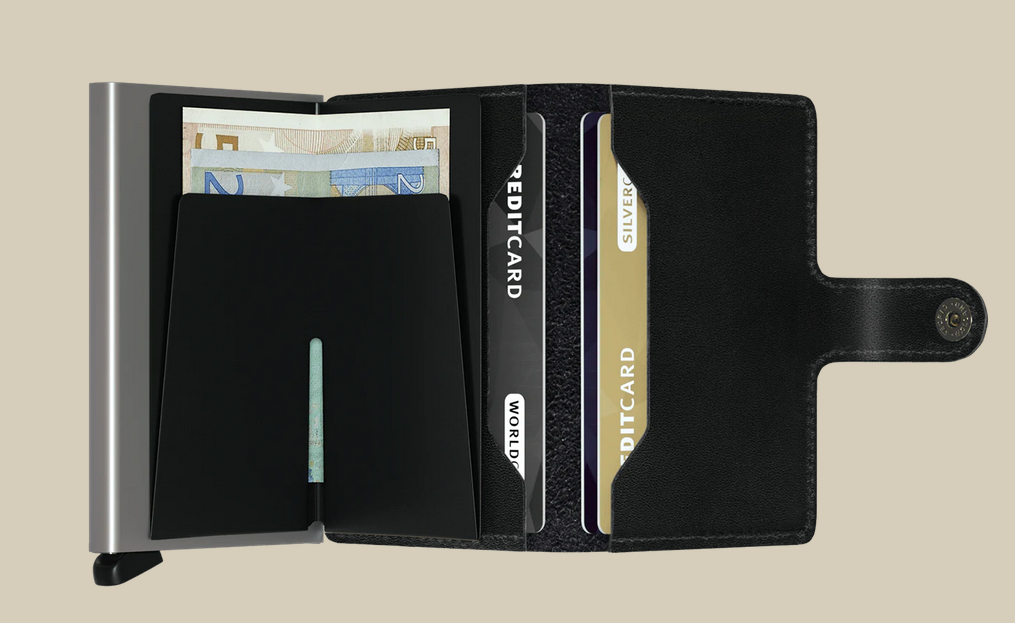 Possibilité d’insérer jusqu’à 6 cartes supplémentaires dans les poches en cuir, ainsi que de l’argent liquide et des reçus.