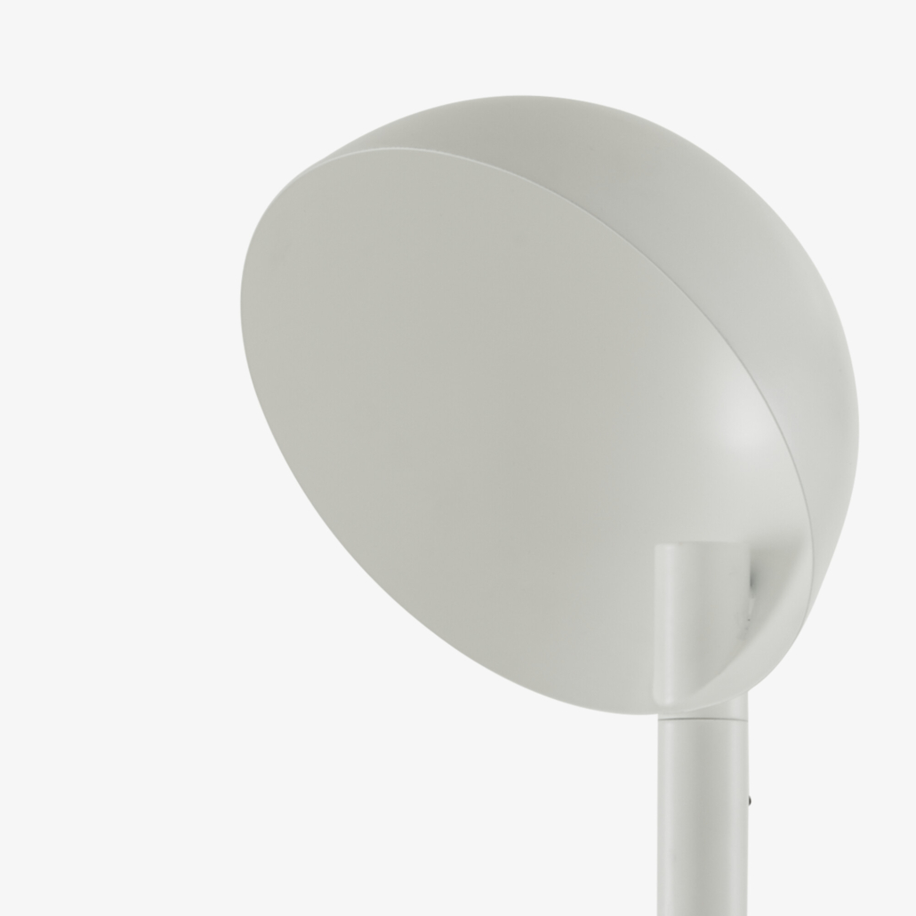 Abat-jour métallique demi sphérique Ø 20 cm, incliné vers le bas à 35° par rapport à la verticale, monté sur un mât métallique de Ø 28 mm. Socle rotatif Ø 24 cm composé de deux disques métalliques d’épaisseur 6 mm espacés de 8 mm. Le premier est fixe et repose au sol, le second tourne autour d’un axe vertical par rapport au premier. Un module LED situé dans le prolongement du mât éclaire l’intérieur de l’abat-jour demi sphérique. La rotation à 360° de l’ensemble mât + abat-jour permet d’orienter l’éclairage indirect ainsi créé vers la zone désirée. Finition laqué Epoxy blanc satiné. Câble électrique PVC blanc, interrupteur à pied blanc. Module LED 3W – 12v, température de couleur 3000 K (blanc chaud), 1380 lumens. Luminaire à LED interchangeables.