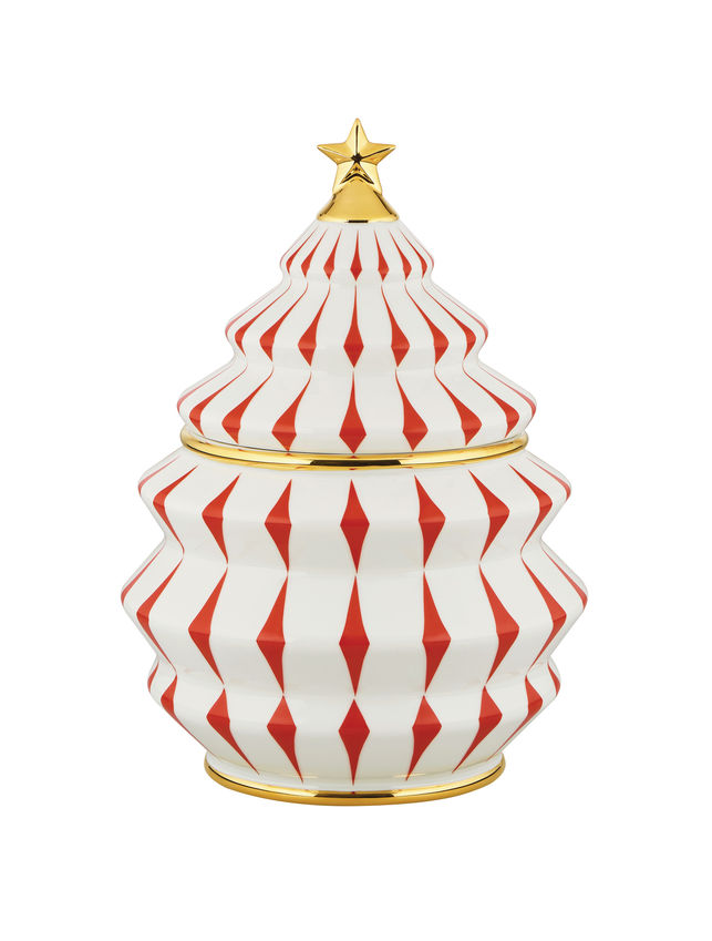Pour offrir un écrin digne des biscuits de Noël, Nika Zupanc a conçu un bocal à biscuits dont la forme rappelle celle d’un sapin de Noël enneigé. Cet objet est visiblement influencé par le langage de design caractéristique de Zupanc, qui interprète les formes et caractéristiques stylistiques traditionnelles de manière moderne et contemporaine. La designer a opté pour des couleurs de Noël traditionnelles : le blanc pour le fond, le rouge pour la décoration du corps et l’or pour la petite étoile qui sert de poignée sur le couvercle, ainsi que pour la fine bordure qui souligne la base et le point où les deux parties du bocal à biscuits se rejoignent. Un objet évocateur, un petit conte de fées moderne qui captive l’imagination et apporte de la joie avec ses lignes délicates et ses couleurs vives.