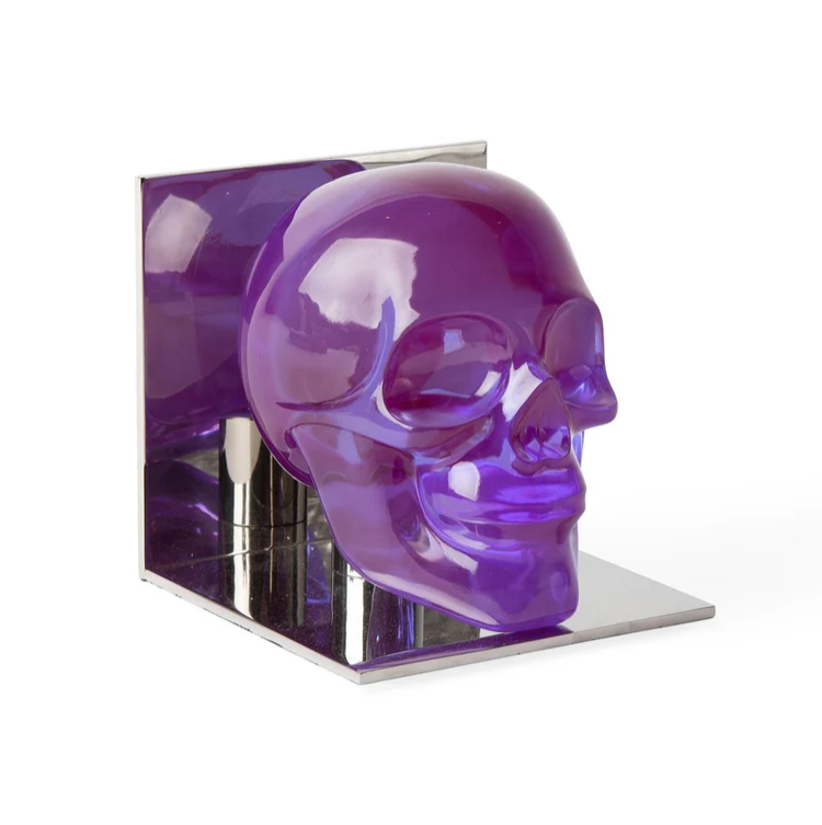 Sculpture de crâne en acrylique violet solide sur cadre en L en nickel poli
