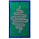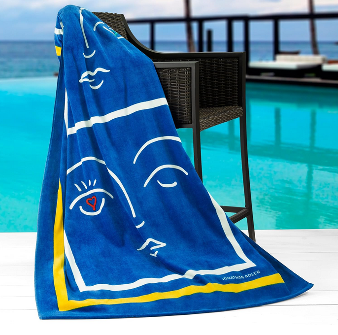 La serviette Muse présente des dessins de visages en blanc sur fond bleu marine, rappelant les masques de théâtre. La finition est assurée par des bordures jaunes et marines.
