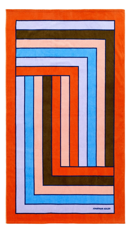 La serviette Scala présente un motif de rayures concentriques orange, marron et bleues qui se dédoublent pour créer un effet 3D.