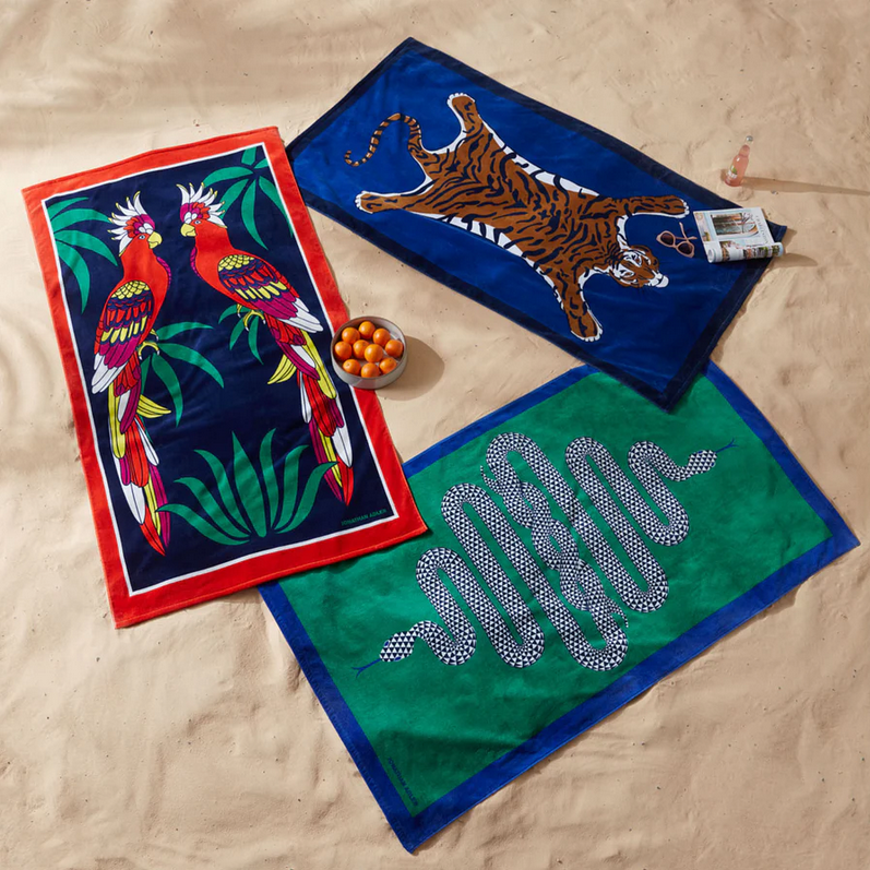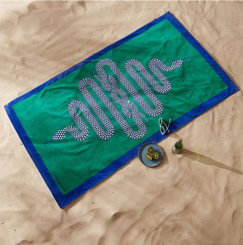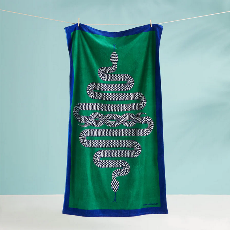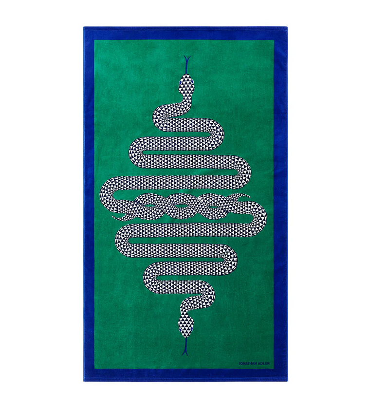 Chantez l’esprit du glamour des stations balnéaires avec nos serviettes de plage de taille généreuse, épaisses et assoiffées. Osez le chic de la plage avec une paire de serpents dorés scintillants sur un fond émeraude. De la plage de sable blanc à la piscine à débordement, elles sont aussi belles drapées sur une chaise longue qu’enroulées autour de vos épaules.