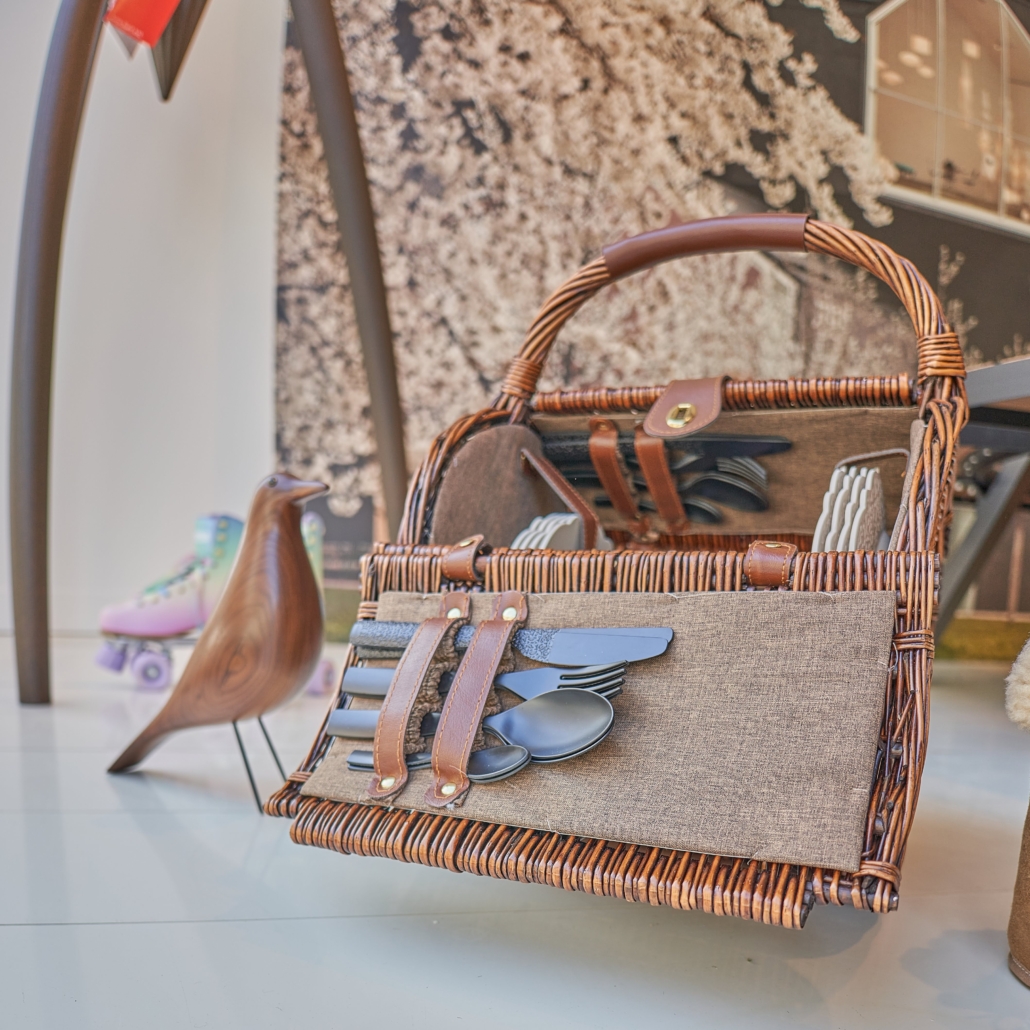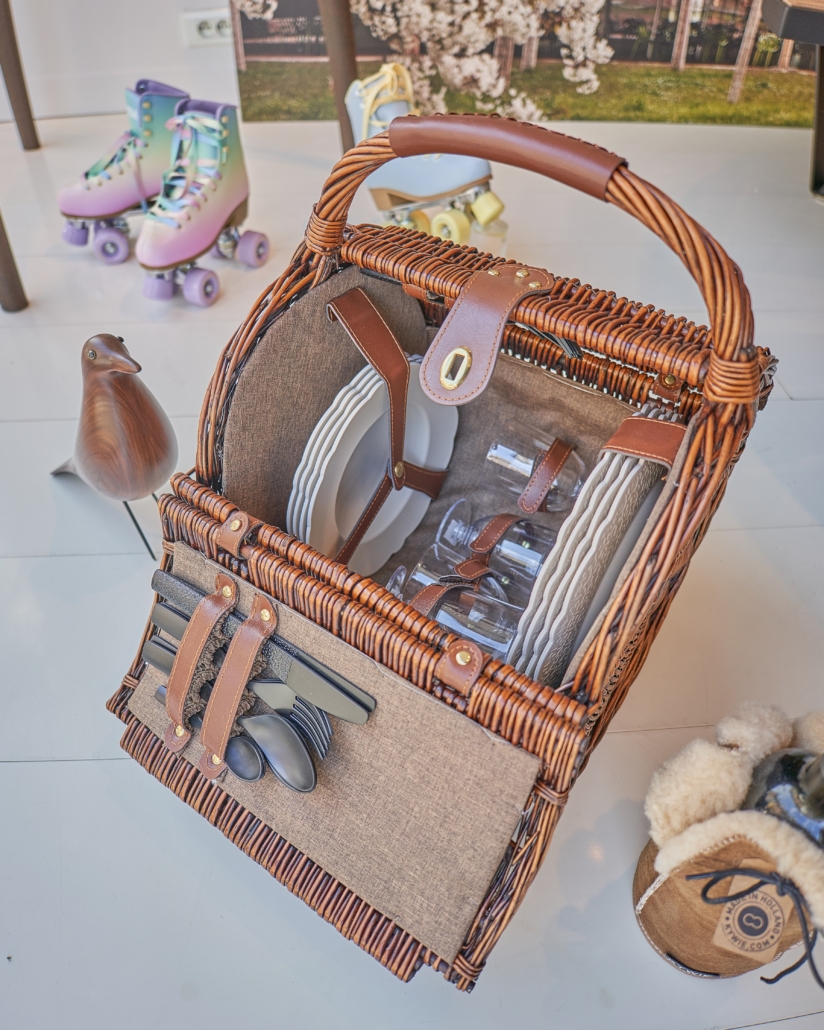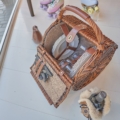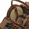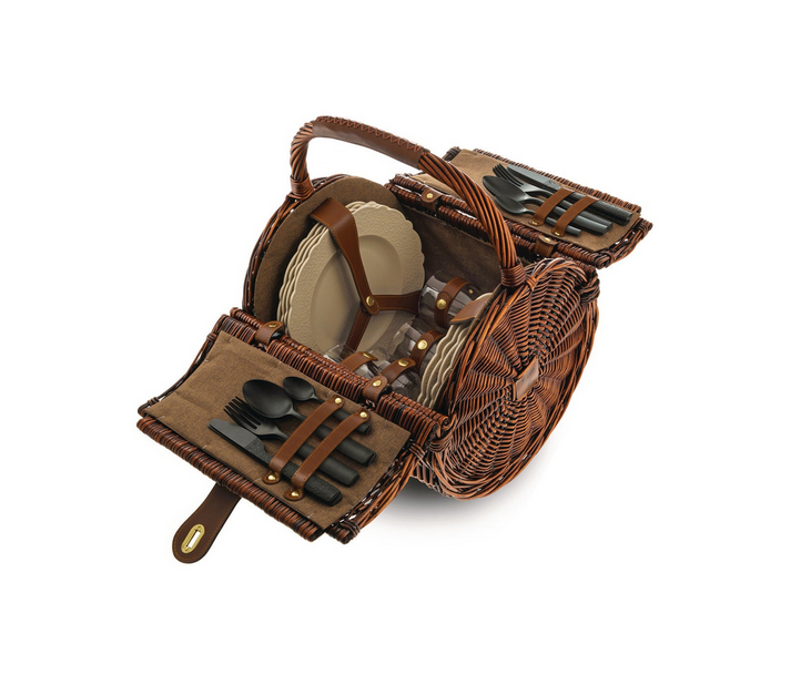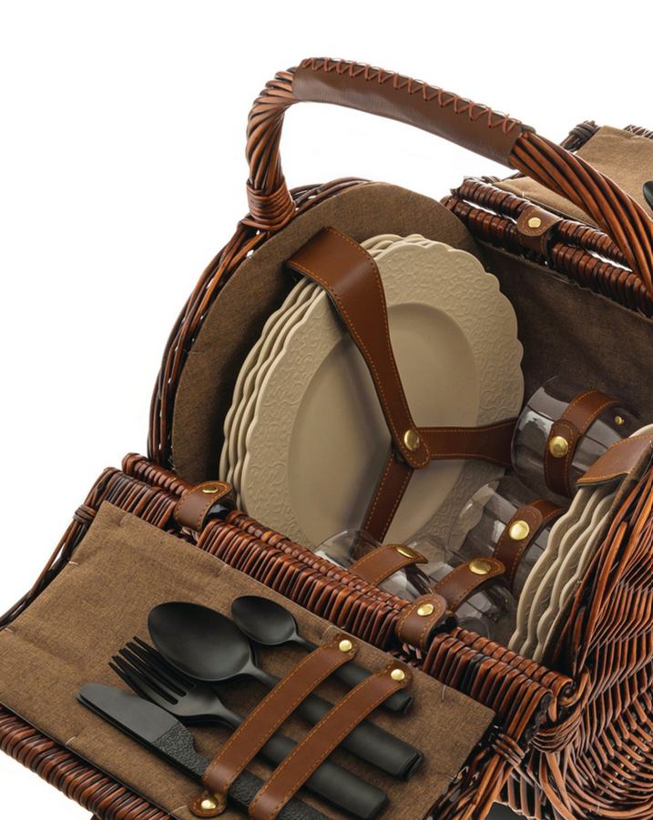 Un charme rétro irrésistible pour ce panier à pique-nique en osier et cuir qui contient tout le nécessaire pour un repas champêtre pour quatre personnes. Le service comprend : 4 assiettes plates, 4 assiettes creuses, 4 cuillères, 4 fourchettes, 4 couteaux, 4 cuillères à café en mélamine et 4 verres en résine thermoplastique (PCTG). Sur la plage ou dans les champs, son esprit campagne chic fera sensation. L’intérieur du panier est recouvert de tissu marron.