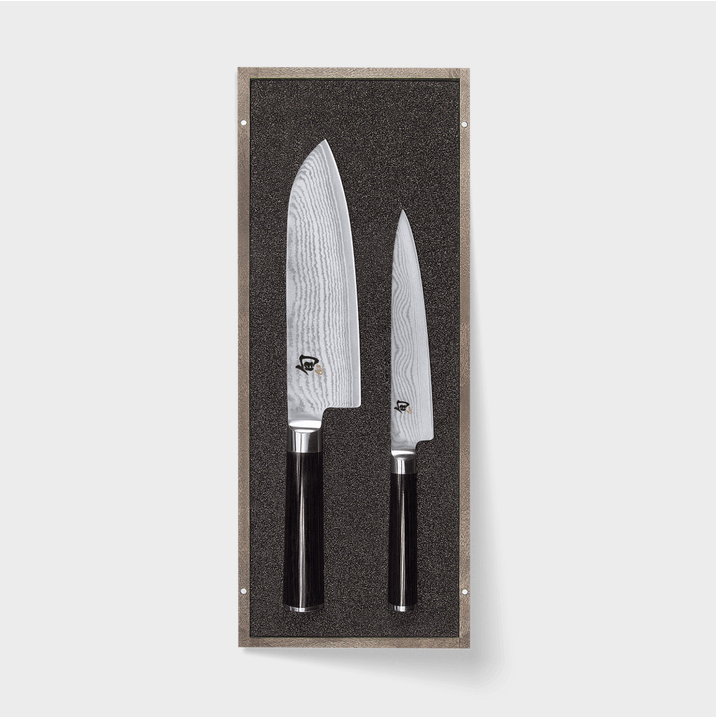 comprend : DM-0701 (couteau universel – lame 15cm), DM-0702 (Santoku – lame 18cm)