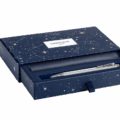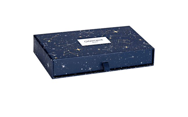 Boîte en carton premium bleu nuit recouverte de motifs galactiques dorés et blancs avec tiroir à ruban