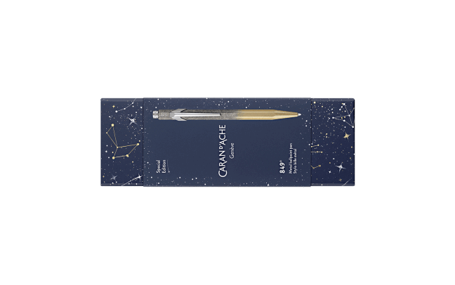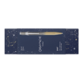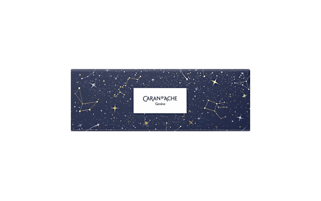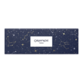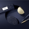 Boîte en carton premium bleu nuit recouverte de motifs galactiques dorés et blancs à ouverture coulissante