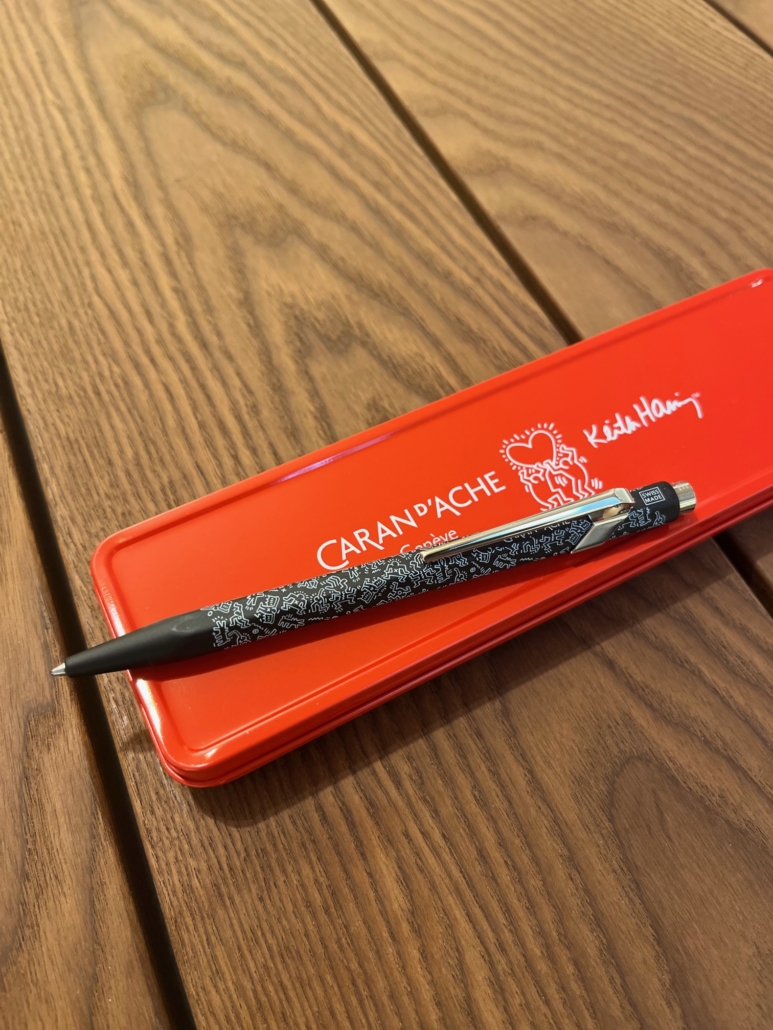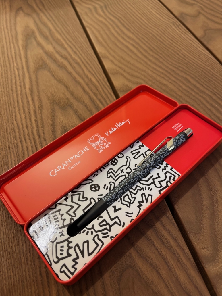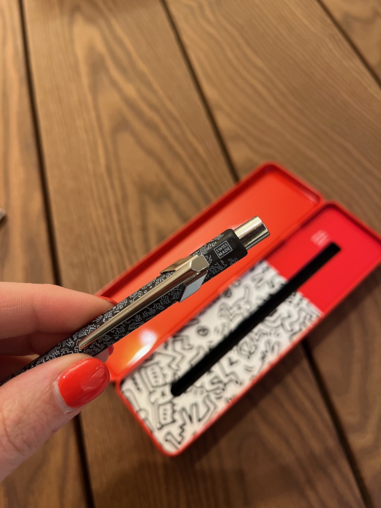 Boîte en métal rouge collector signée du logo du partenariat et fourreau habillé de l’identité de la collection – motif iconique de Keith Haring et rouge Caran d’Ache