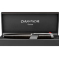 Bouton capuchon argenté-rhodié, doté de l’identification Caran d’Ache (hexagone laqué noir)