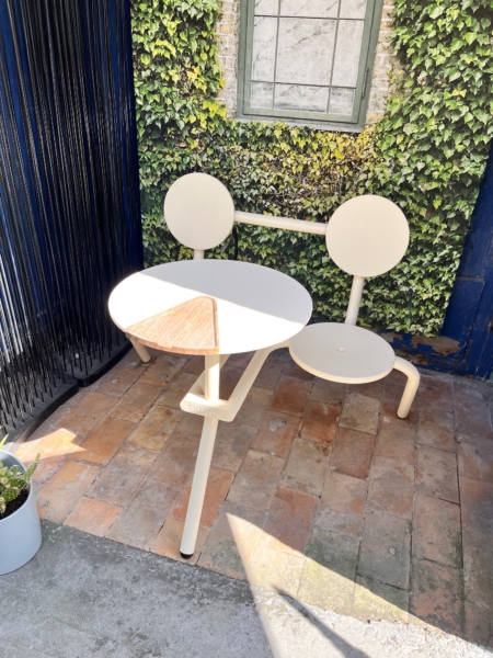 Trois pieds, deux chaises et une table : tout ce qu’il faut pour profiter du monde qui passe.