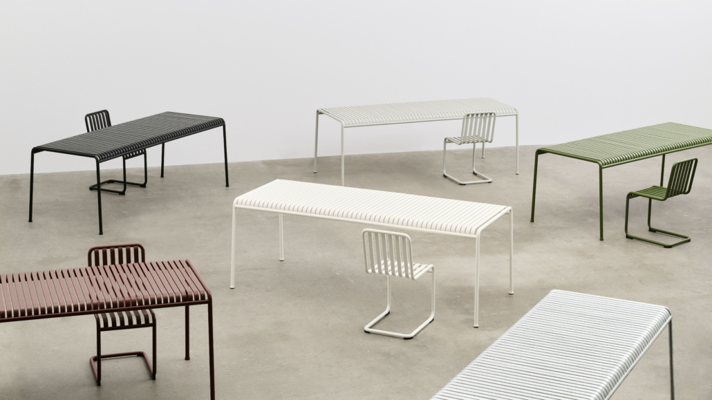 La table Palissade de HAY, créée par les frères designers Ronan et Erwan Bouroullec, est idéale pour l’extérieur. Mesurant 170 x 90 cm, elle peut accueillir jusqu’à 6 personnes.