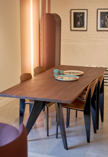L’aspect esthétique de la table EM de Jean Prouvé est conforme aux principes structurels, illustrant le flux des forces et des contraintes dans sa construction. Elle est disponible en plusieurs tailles avec des plateaux en bois massif de première qualité ou en stratifié HPL dans un choix de couleurs. Les plateaux d’une longueur de 2000 ou 2400 mm sont également disponibles en placage de chêne. Grâce à ce vaste choix, il est possible de trouver la table EM idéale pour chaque salle à manger.