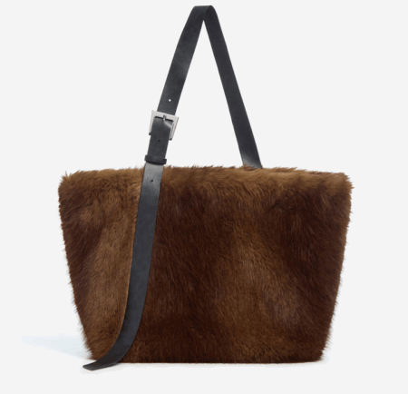 Fourrure synthétique recyclée imitation vison avec doublure en daim synthétique collé et bandoulière en cuir Sans.