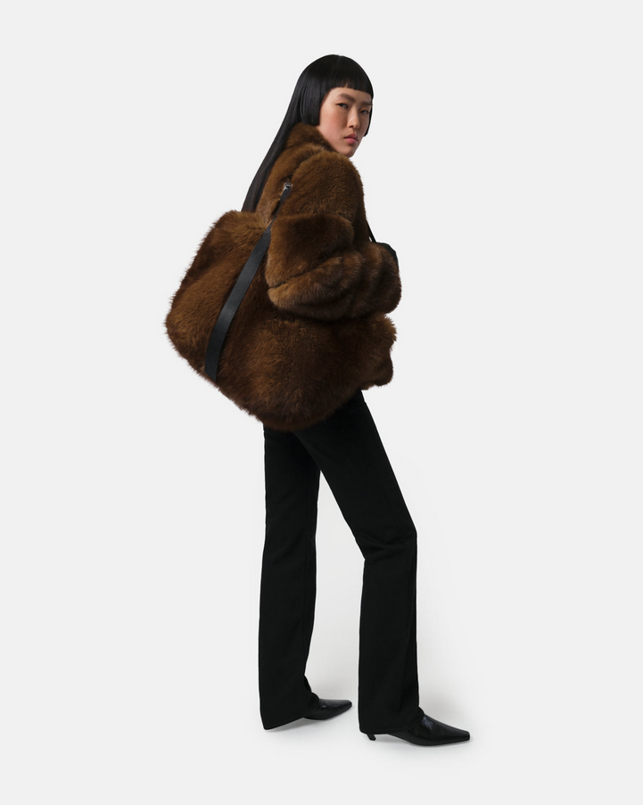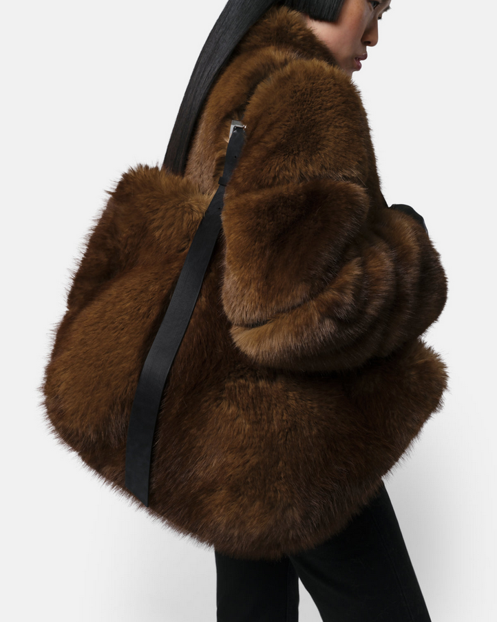 Fourrure synthétique recyclée imitation vison avec doublure en daim synthétique collé et bandoulière en cuir Sans.