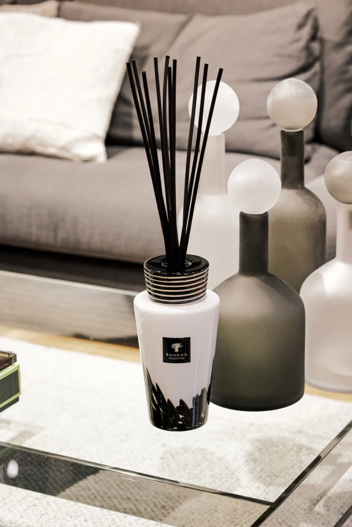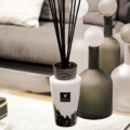 Le flacon du diffuseur de parfum Totem Feathers a demandé toute l’expertise de nos artisans verriers qui ont introduit dans le verre opalin soufflé-bouche des confettis noirs formant un effet délicat de plumes.